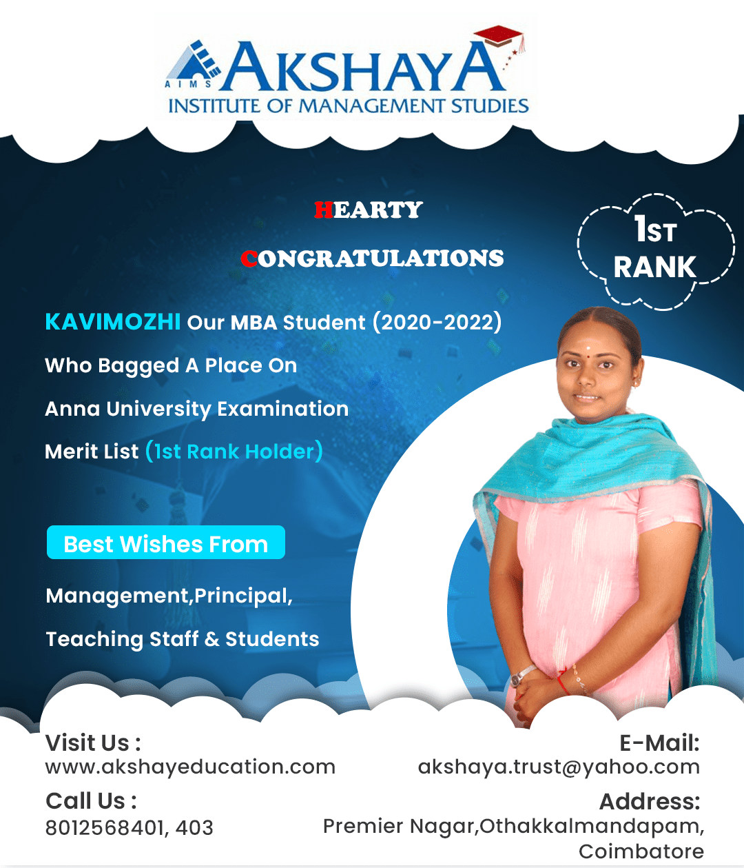 Akshaya Institute of Management Studies (AIMS) is one of the top management colleges in Coimbatore, functioning under the aegis of the Akshaya Educational Charitable Trust, a registered non-profit organization. The Trust was established in the year 2009 to render educational services to the suburban and rural society. The trust is reputed for imparting a high quality of education and thereby creating a pool of professionally qualified and skilled managers and entrepreneurs to meet the challenging needs of the global trade and industry. It has performed a stellar role in spreading education among the rural youth with a determined vision.
